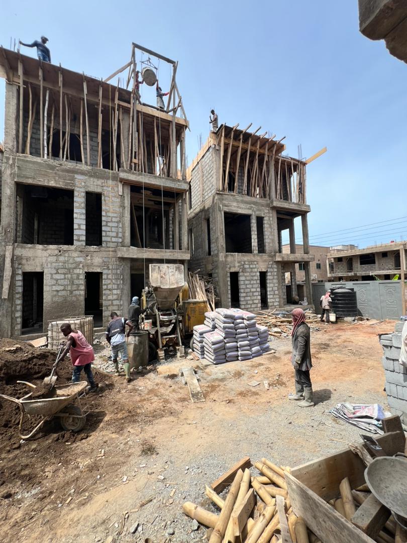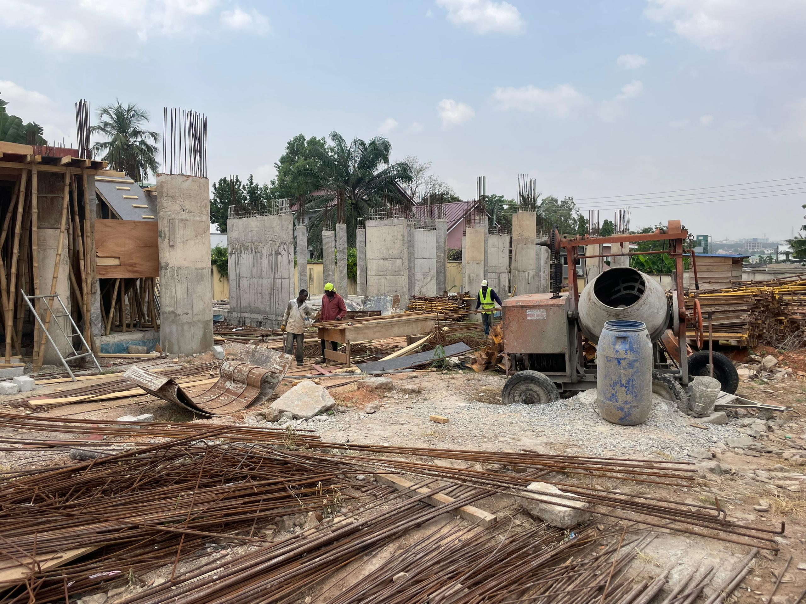 A construction site with scaffolding set up around a building partially made of bricks and concrete. Two workers are present; one is on the scaffolding, and the other is walking on the ground wearing protective gear. The area is surrounded by palm trees, and there is a small pavilion with a green roof in the background. Various construction materials and debris are scattered on the grass.